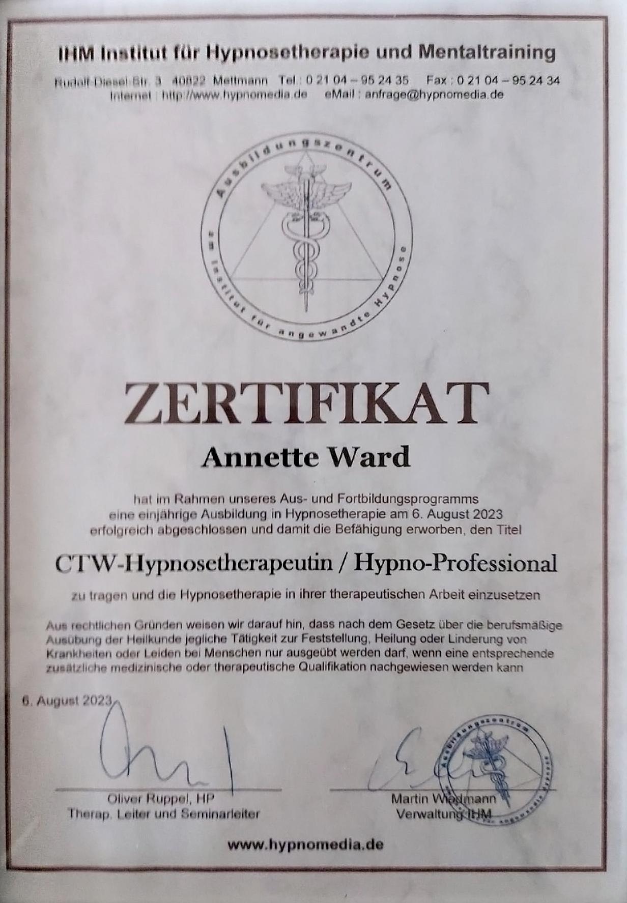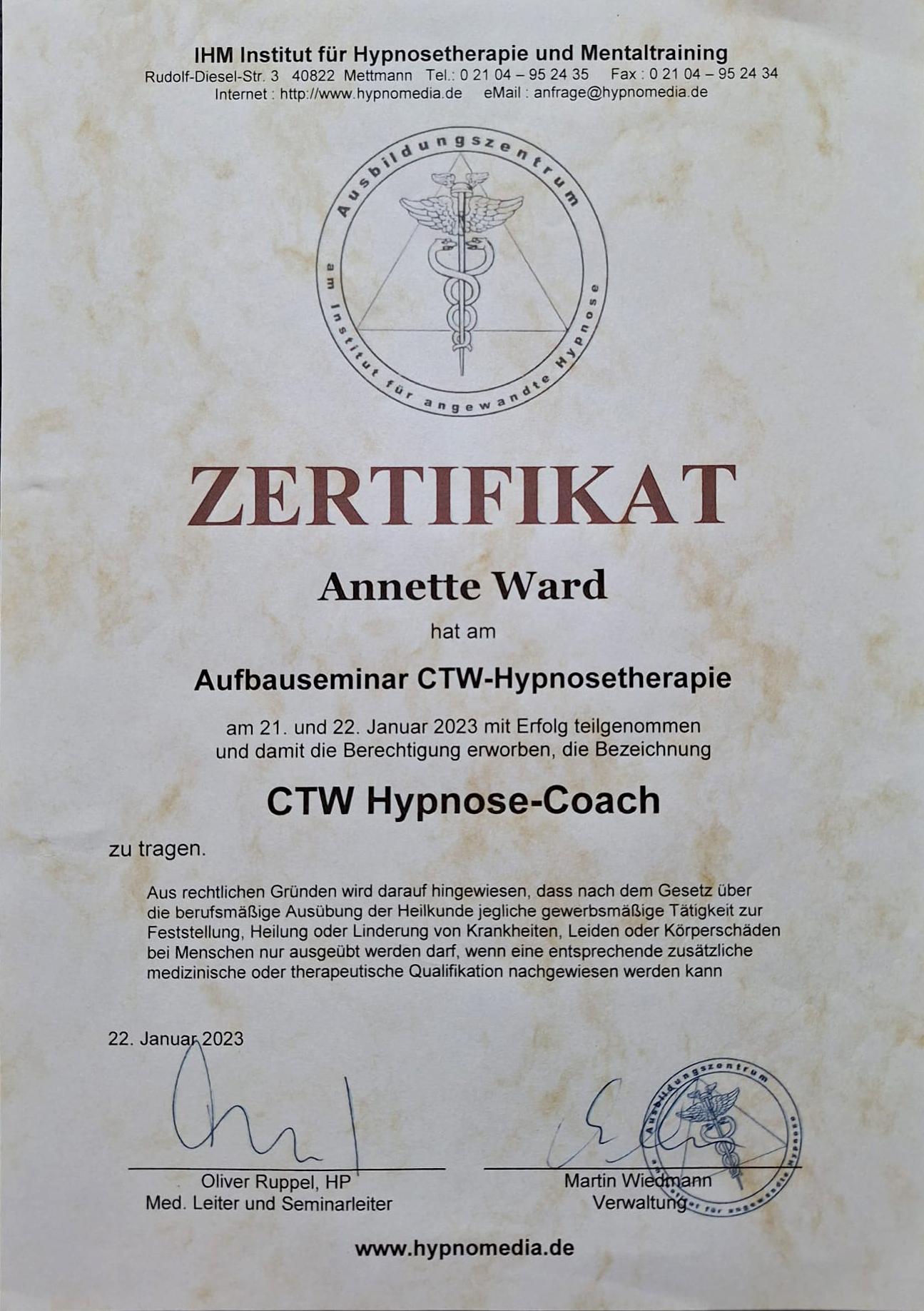 2023 Ausbildung zum CTW-Hypnose-Coach, IHM – Institut für Hypnosetherapie und Mentaltraining